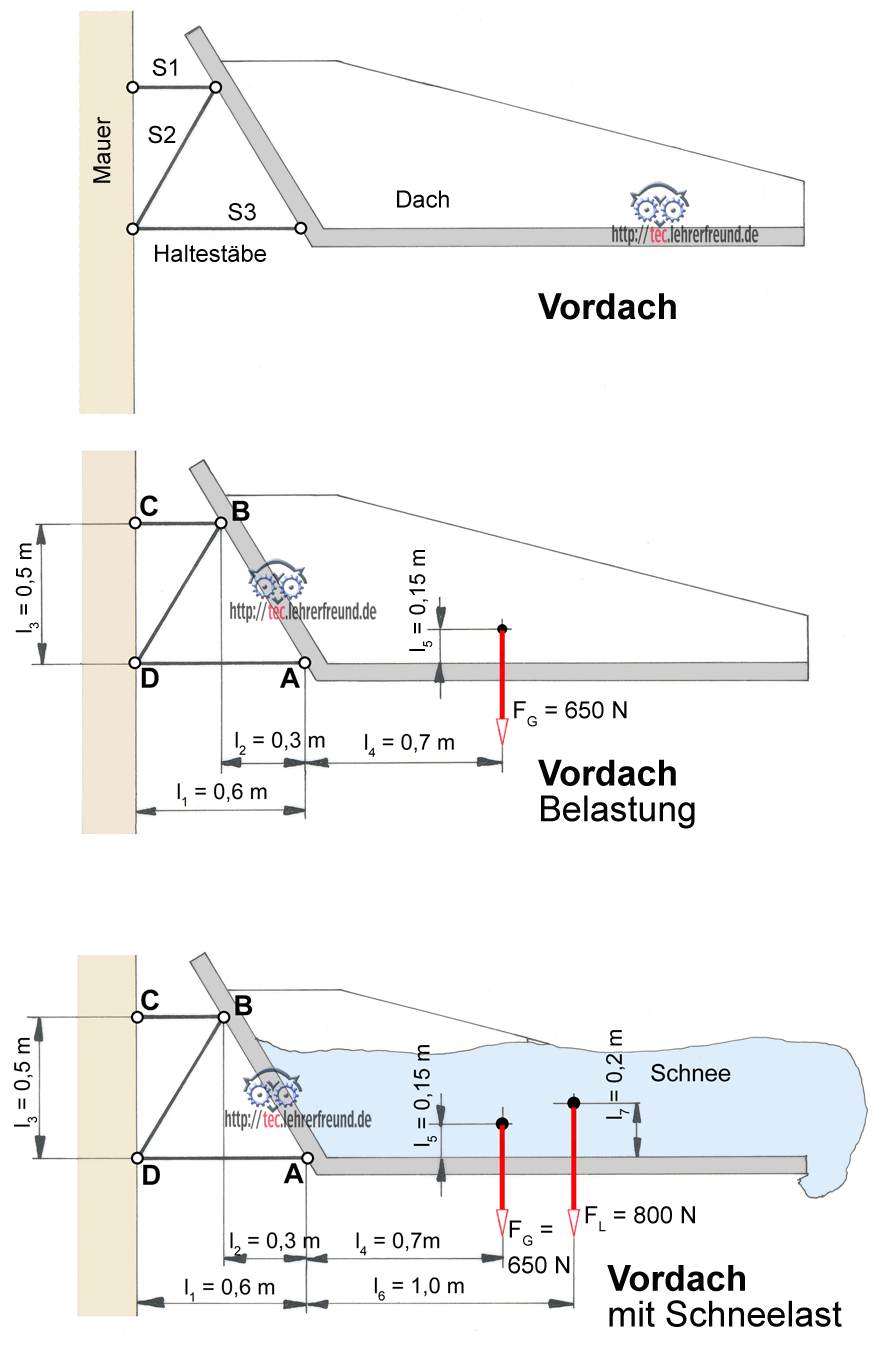 2. Das Vordach muss eine Schneelast von 800 N tragen können (Abstände usw. siehe Skizze). Wie groß sind die Stabkräfte jetzt?