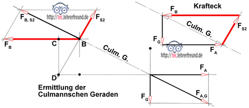 Am Punkt B greifen zwei weitere Kräfte an: FB und FS2. Die Resultierende von FA und FG muss auch die Resultierende von FB und FS2 sein, allerdings mit entgegengesetzter Richtung. Beide Resultierende liegen auf derselben Wirkungslinie, die nichts anderes ist als die Culmannsche Gerade.