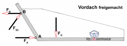 Dabei werden anstelle der Stäbe die auf das Vordach wirkenden Kräfte eingezeichnet. Man erkennt: Es sind die vier Kräfte FG, FA, FB und FS2. Um das Gleichgewicht von vier Kräften zu finden, benötigen wir die Culmannsche Gerade.