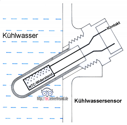 In Reihe zum RNTC liegt ein Festwiderstand RSt = 1,5 kΩ. Der hohe Widerstand hat die Aufgabe, den durch den NTC-Widerstand fließenden Strom klein zu halten. Der Rechner erhält als Information die Teilspannung USt. Damit kann er, wenn z. B. die Kühlwassertemperatur unzulässig steigt, ein Signal an das Einspritzsystem geben. Dieses reduziert die Menge des eingespritzten Kraftstoffs, was eine Leistungsminderung und damit eine Wärmeverringerung zur Folge hat.