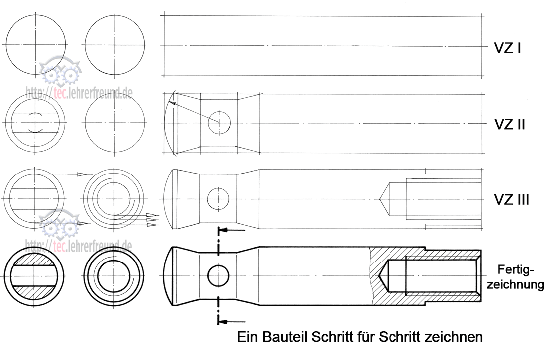 Eine technische Zeichnung mit Zeichenplatte, Bleistift, Zirkel und Lineal herstellen, kann anstrengend sein. Je klarer die Vorstellung des Zeichners davon ist, in welcher Reihenfolge er zeichnen sollte, desto leichter fällt ihm das Geschäft. Wir zeichnen ein Werkstück in der richtigen Reihenfolge.