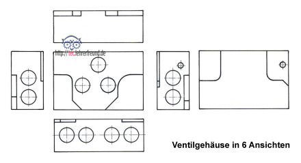 Zeichnen Sie das Ventilgehäuse in 6 Ansichten und ordnen Sie die Ansichten nach Norm.