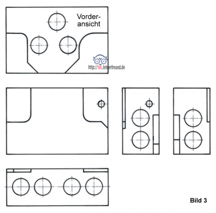 b) In Bild 3 ist ein Teil der Ansichten ungeordnet im M1:1 gezeichnet. Die Bohrungen sind vereinfacht als Bohrbild mit großen und kleinen Bohrungen dargestellt, verdeckte Kanten wurden weggelassen.