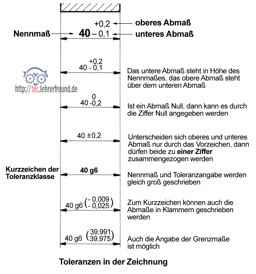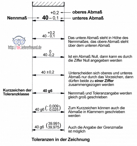 Für die Herstellung muss es auf jeder Zeichnung einen Hinweis geben, nach welcher Toleranzklasse das Bauteil zu fertigen ist. Verlangt ein Werkstück jedoch andere als die in der Tabelle stehenden Abmaße, dann werden sie neben dem jeweiligen Nennmaß angegeben.