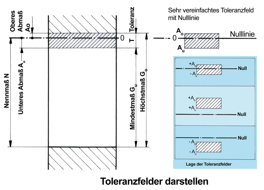 Das Nennmaß wäre das ideale Sollmaß. Es muss in der technischen Zeichnung auf jeden Fall angegeben werden. Handelt es sich um zwei für den Zusammenbau vorgesehene Teile - z.B. eine Bohrung und eine Welle -, dann erhalten beide Teile dasselbe Nennmaß. Die Toleranzen beziehen sich auf das Nennmaß, das man in Erklärungen wie hier auf eine vereinfachte Nulllinie reduziert. 6 Schlüsselbegriffe sind: