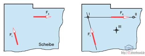 Auf die skizzierte Scheibe wirken die Kräfte FI und FII. An welcher Stelle sollten wir für die Berechnungen den Drehpunkt wählen?
