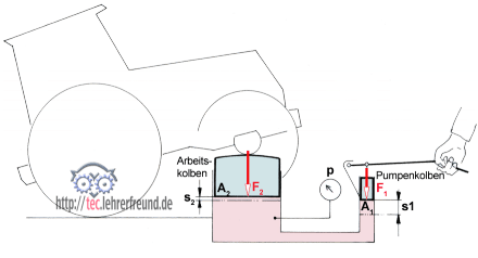 Wir bezeichnen die Pumpenseite mit dem Index 1, die Arbeitsseite mit 2. Die am Pumpenkolben 1 aufgewendete mechanische Arbeit W1 = F1 ∙ s1 wird an den Verbraucher, also den Arbeitskolben weitergegeben; sie ist am Ausgang gleich groß wie am Eingang (wenn man die stets vorhandenen Reibungsverluste vernachlässigt). Die Kraft F2 am Ausgang ist dagegen größer als F1 am Eingang, was auf Kosten des Wegs s gehen muss. Diese Erkenntnis wird mit der »Goldenen Regel der Mechanik« ausgedrückt. Sie besagt: Was an Kraft gewonnen wird, geht an Weg verloren: Beim großen Pumpenhub s1 ergibt sich nur ein kleiner Arbeitshub s2, dafür aber ein große Hubkraft F2.
