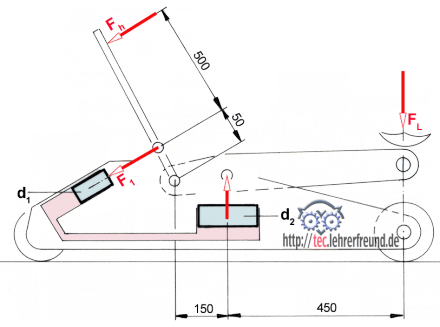 f) FL–> F2 ∙ 150 mm = FL ∙ 600 M