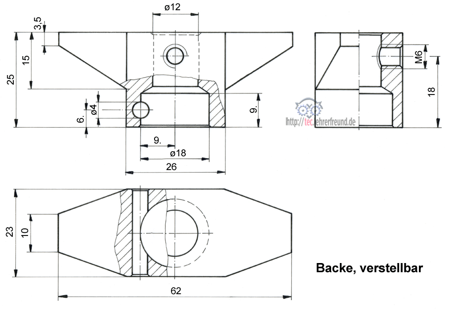 2.2 Stellen Sie die bewegliche Backe Pos. 3 in den erforderlichen Ansichten dar. Bemaßen Sie sie normgerecht. Toleranzen und Oberflächenzeichen sollen nicht berücksichtigt werden.