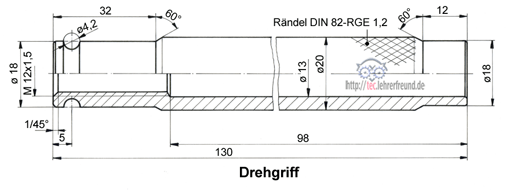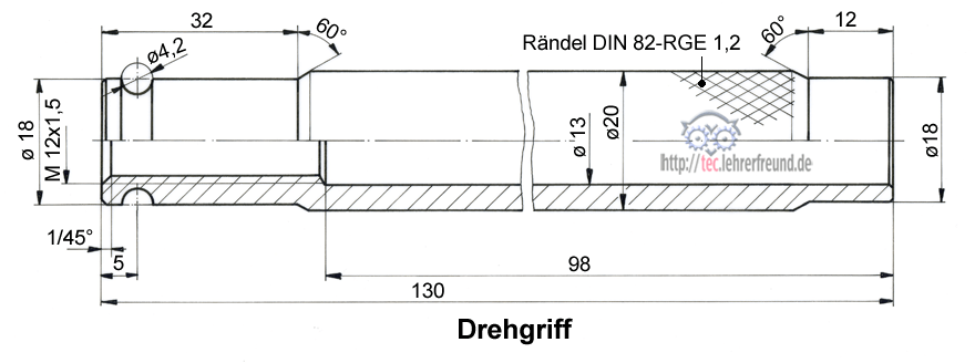b) Bemaßen Sie den Drehgriff. Angaben dazu: Außendurchmesser 20 mm, Gesamtlänge 130 mm. Legen Sie alle anderen Abmessungen selbst fest. Der Rändel ist ein Rändel DIN 82-RGE 1,2. Weitere Angaben zum Rändeln finden Sie ganz unten.