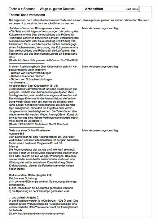 Arbeitsblätter »Texte verbessern« (pdf) und Lösung