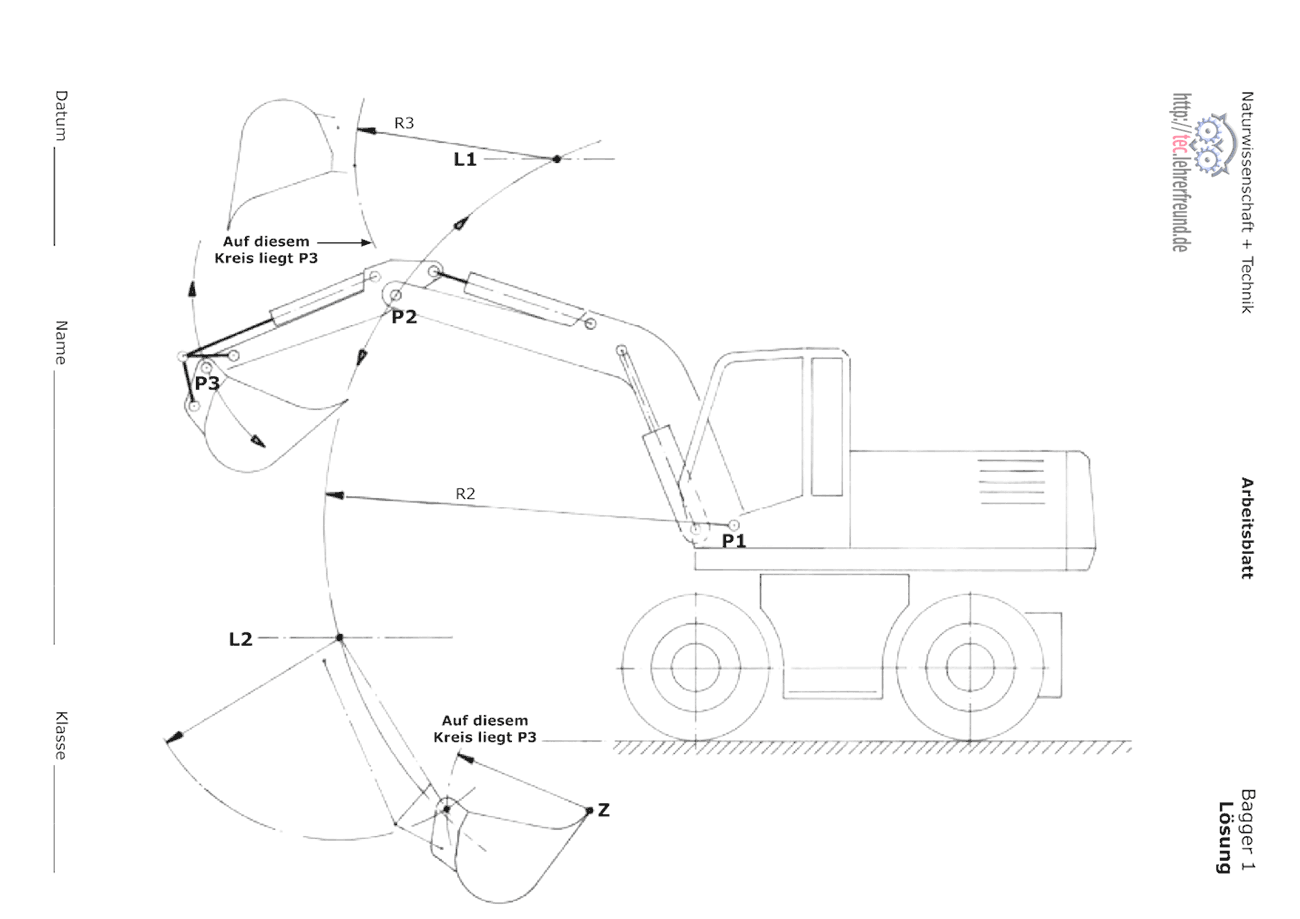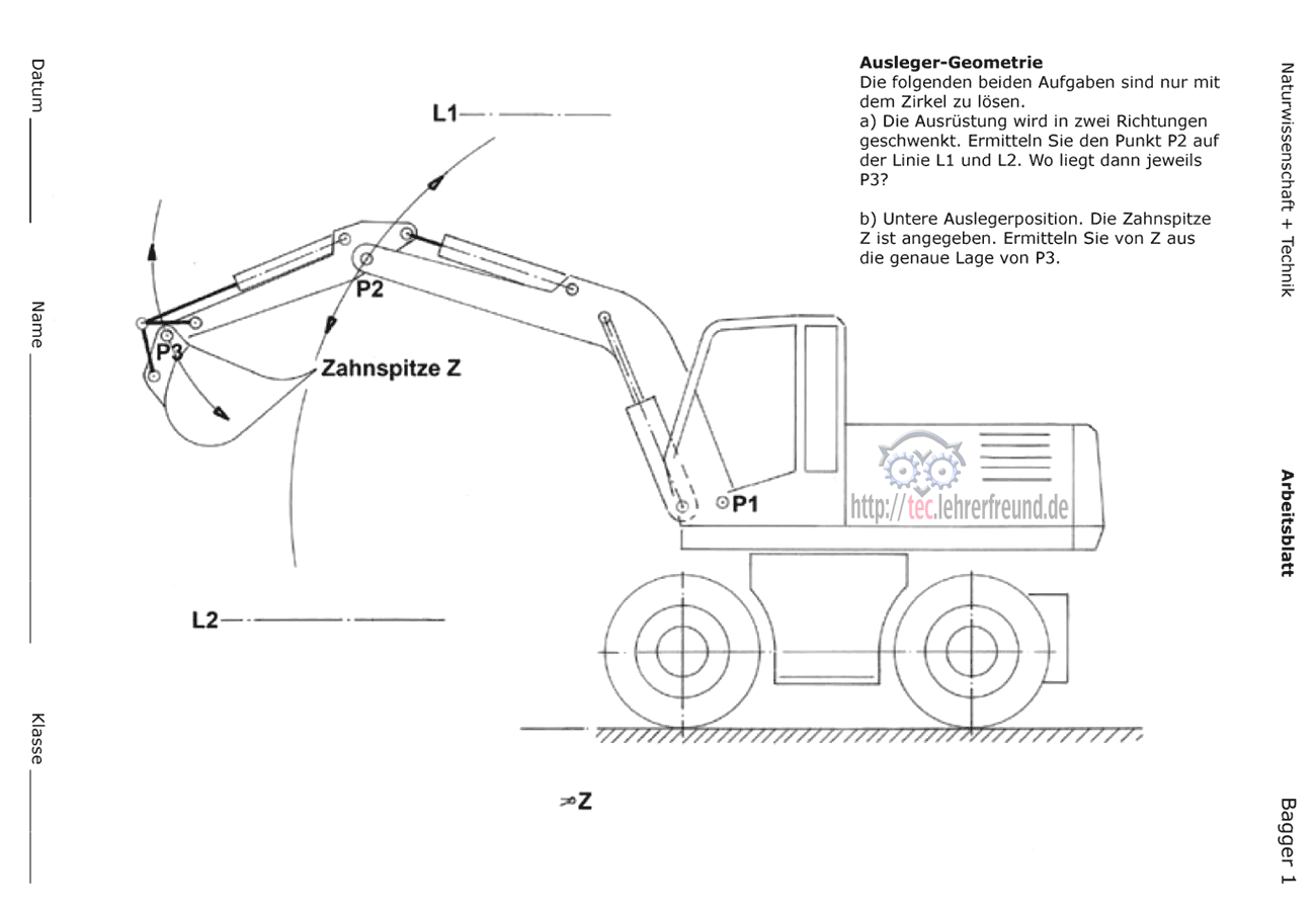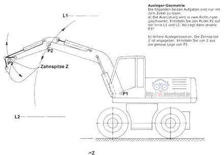 Eine ganze Reihe der geometrischen Übungen, mit denen sich Schüler abplagen, lässt sich auf diesem Arbeitsblatt zur Auslegergeometrie des Baggers anwenden.