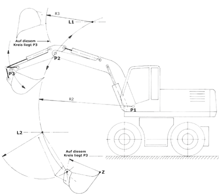 - Untere Auslegerposition. Die Zahnspitze Z ist angegeben. Ermitteln Sie von Z aus die genaue Lage von P3."
