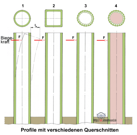 Die Durchbiegung ergibt sich aus dem Widerstandsmoment W (siehe auch http://www.lehrerfreund. de/in/technik/1s/festigkeitsberechnungen- 4-biegung/3701/). Es ist bei Profil 1: W = (D4 - d4) · p : 32 · D (d = innerer Durchmesser) Profil 2: W = (a · b3 – ai · bi 3) : 6 · a