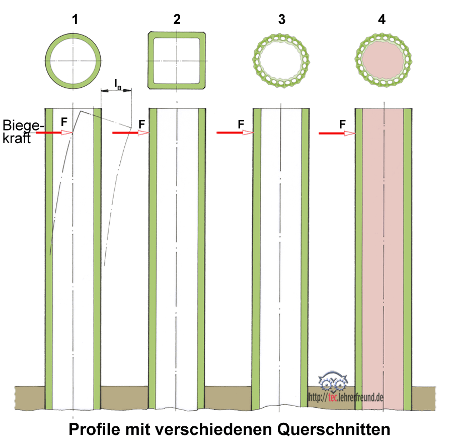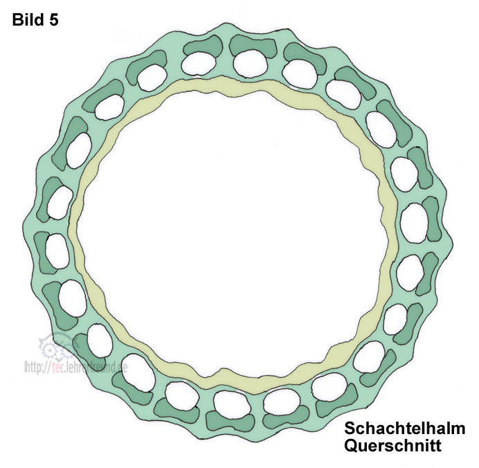 Bei einigen Anwendungen ist jedoch nicht nur eine bestimmte Biegesteifigkeit oder Elastizität erforderlich, auch Torsionsbelastungen muss standgehalten werden. So besitzt der Winterschachtelhalm (Equisetum hyemale) als tragendes Element ebenfalls an der Stängelaußenseite einen Ring aus festigenden, dickwandigen Zellen (diese Zellen sind nicht verholzt, aber sehr dickwandig). Dieser Ring ist aber nicht gleichmäßig dick, sondern regelmäßig an einigen Stellen dünner, an anderen ragen verholzte Fasern ins Innere des Rings hinein. Auf diese Weise entsteht eine Art T-Profil, das neben der Biegesteifigkeit zusätzlich auch eine hohe Torsionsbeständigkeit garantiert (Bild 5, tec.lehrerfreund).