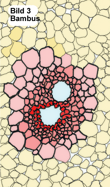 Am Seeufer ist dieses Riesengras den sich auf der glatten Wasserfläche frei entwickelnden Winden voll ausgesetzt. Und obwohl der gesamte Halm Blätter trägt und der Halm nur wenige Zentimeter dick ist, kann dem Gras selbst starker Wind nichts ausmachen. Wie die Hohlachsen die Windenergie aufnehmen und geschickt umwandeln, gehört zu den Geheimnissen, denen die Forscher nachgegangen sind. Wieder zeigt sich, dass ein bestimmter Aufbau des Halmes der Schlüssel für diese Eigenschaft der Pflanzen ist. Ähnlich wie beim Holz ist die Anordnung von steifen Bereichen (Sklerenchym oder Festigungsgewebe) und weicher Matrix, dem Parenchym (wenig spezialisiertes Grundgewebe), entscheidend (Bild 3, tec.Lehrerfreund).