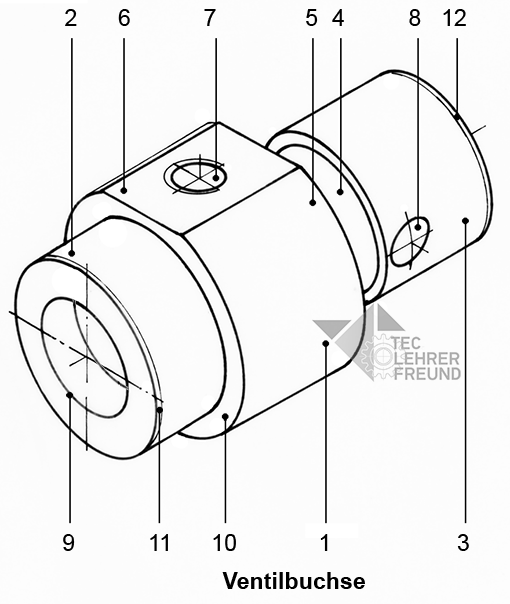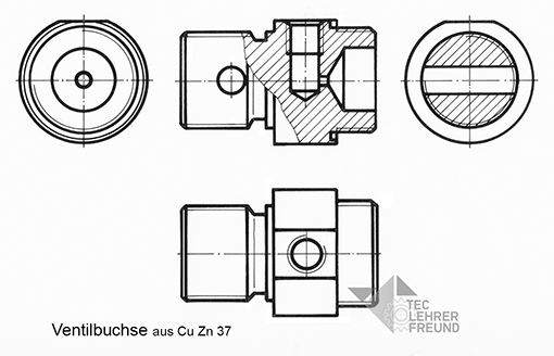 Eine in Perspektive dargestellte Ventilbuchse soll in Ansichten gezeichnet werden.