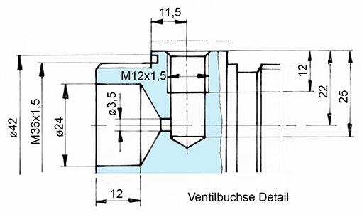9 ø24. Siehe Skizze »Ventilbuchse Detail«. ø24 ist über eine Bohrung ø3,5 mit der Sackbohrung M12x1,5 verbunden.