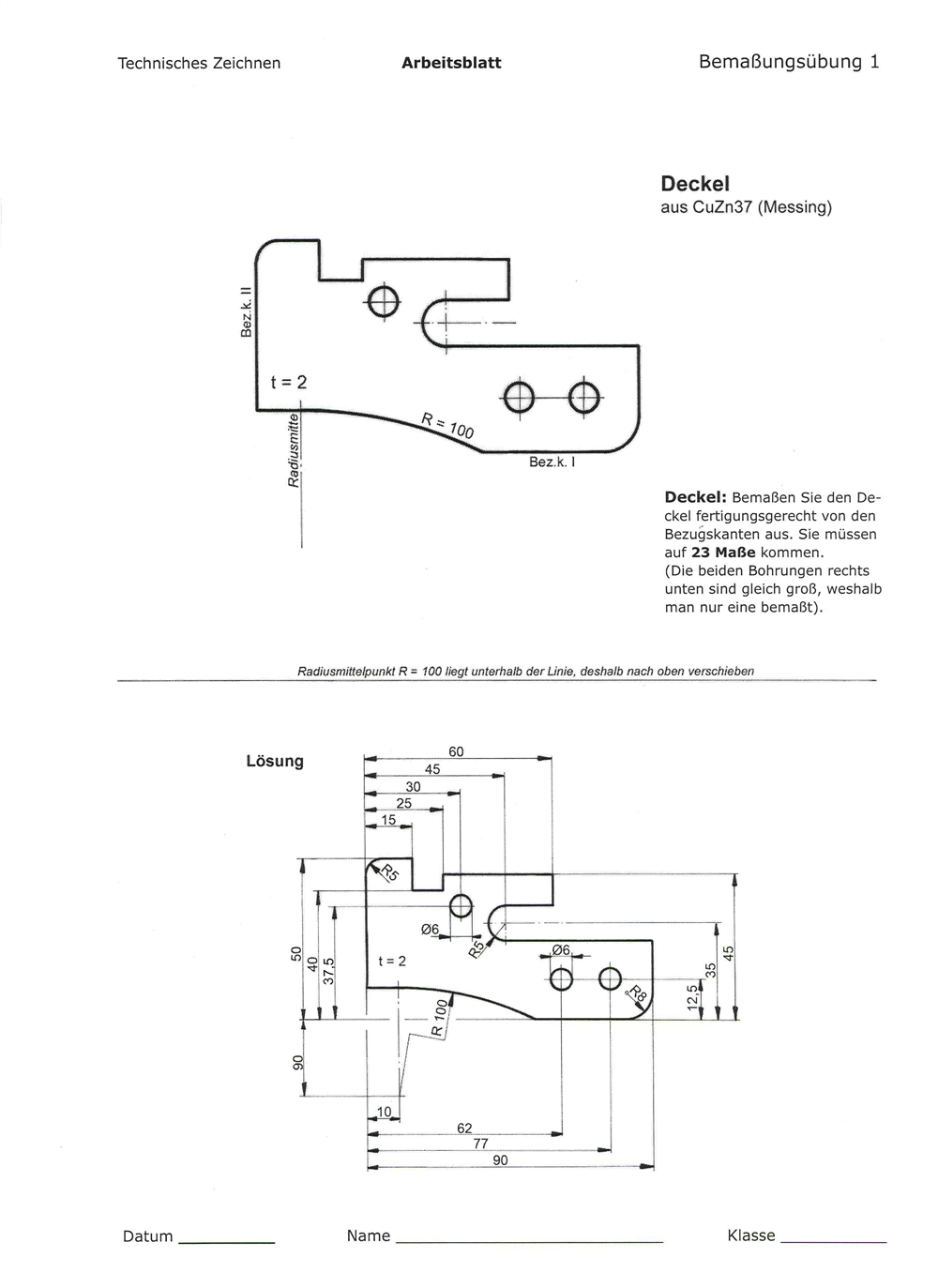 Mit dem Arbeitsblatt soll ein Deckel aus CuZn37 (Messing) bemaßt werden. Aufgabentext: