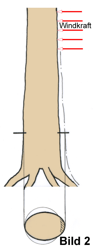 Bild 2: Am Baumstamm lässt sich zudem beobachten, dass er sein Wachstum besonderen äußeren Belastungen anpasst. Wirkt an der bezeichneten Stelle mehr Winddruck als an anderen Stellen, dann lagert der Baum dort zusätzliches, stabilisierendes Material an, wo sich die Kraft am stärksten auswirkt: Das sind weiter unten liegende Querschnitte, in der Draufsicht als Ellipse dargestellt.