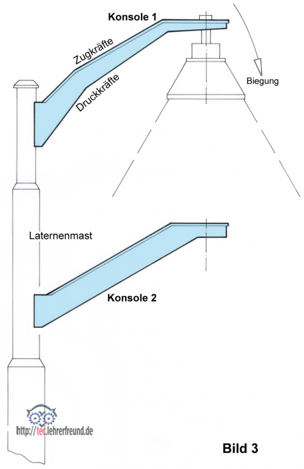 Bild 3: Nicht zuletzt wirken Naturformen immer ästhetisch, also schön. Der Lampenmast mit Konsole kann das zeigen: Konsole 1 - hier Material sparend konstruiert - ist dem Baumast nachgebildet. Die Form der Konsole 2 wirkt, auch wenn sie ihren Zweck erfüllt, im Vergleich zur Konsole 1 eher unbeholfen.