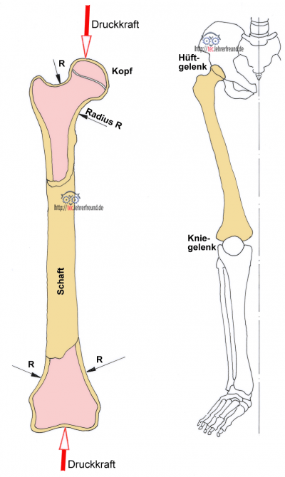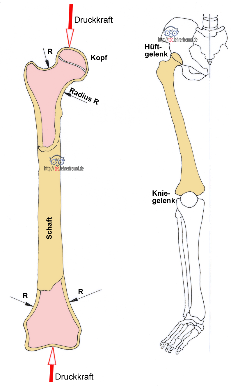 Auch an den hoch beanspruchten menschlichen Knochen kann man die oben beschriebenen Eigenheiten studieren. Am Oberschenkelknochen gehen der obere Kopf und die unteren Gelenkknorren in weit geschwungenen Radien in den Schaft über. Auf diese Weise werden Druckkräfte sauber in den Knochen eingeleitet. Das Innere des Knochens (rosa Partie im Bild unten) ist ausgefüllt mit einem Gewebe1), das eine ähnliche Struktur hat wie ein Badeschwamm. Untersuchungen haben gezeigt, dass diese Anordnung Kräfte optimal aufnimmt und verteilt. Mit dieser Erkenntnis konnte die Bionik einen Beitrag für die Entwicklung hochfester Leichtbaukonstruktionen liefern.