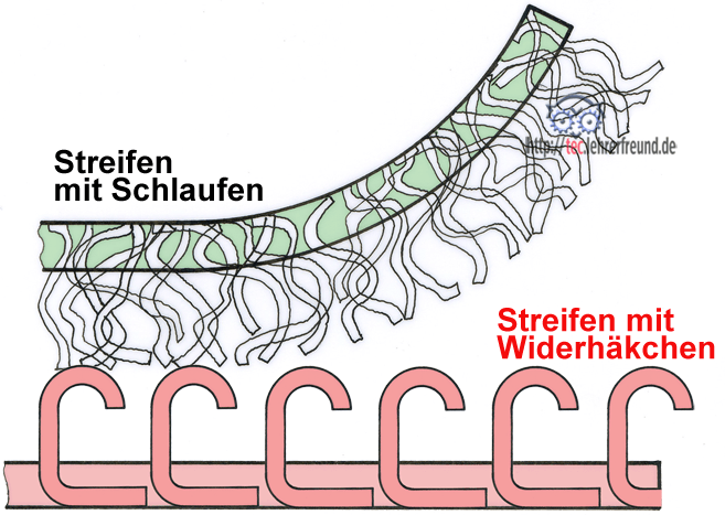 Der Klettverschluss besteht aus zwei Nylonstreifen: Der eine ist mit elastischen Widerhäkchen besetzt, der andere mit der weichen Schlaufenstruktur eines Kunststoffflauschs. Presst man die beiden Streifen zusammen, dann verhaken sich Schlaufen und Haken ineinander und bilden so einen haltbaren Schnellverschluss.