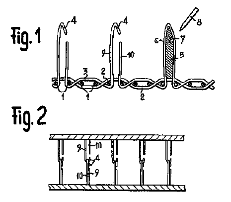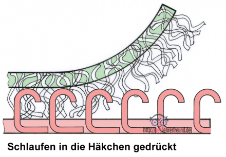 Das Bild mit Fig. 1 und Fig. 2 zeigt eine Vergrößerung des Gewebes. Es besteht aus Schussfäden 1, Kettfäden 2 und 3 und den zunächst geschlossenen Schlingen 6. Durch die Schlingen wird ein Messerbalken 5 geschoben. Mit dem Messer 8 werden die Schlingen an Stelle 7 (Nute im Messerbalken) durchtrennt, so dass die Haken entstehen.