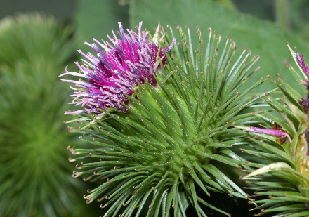 Die »Große Klette« (lat. Arctium lappa) bildet kugelförmige Früchte mit Spitzen aus, die an ihrem Ende winzige elastische Häkchen tragen. Sie klammern sich hartnäckig im Fell von vorbeistreifenden Tieren, an Vogelfedern oder an Kleidern von Menschen fest.