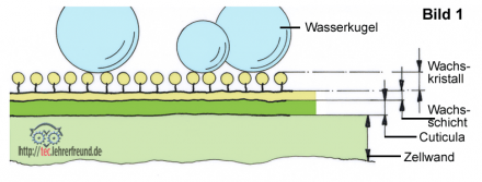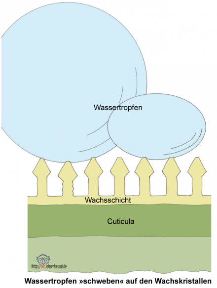 Das Wachs bildet winzige, zum Teil nur 200 nm (nm = Nanometer; 1 nm = 1/1 000 000 000 Meter = 1/1 000 000 mm) große Kristalle. Diese ragen aus der Blattoberfläche heraus und halten das Wasser auf Abstand zum Blattgewebe. Die Pflanze hat diesen Mechanismus entwickelt, um Krankheiten abzuwehren. Das Blatt bleibt dadurch trocken und schädliche Mikroorganismen sind von der Feuchtigkeit, die sie für ihr Tun benötigen, abgeschnitten. Berühren sie aber den Tropfen, ertrinken sie sofort darin; das abperlende Wasser »entsorgt« sie bei nächster Gelegenheit.