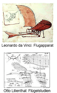 Der Überblick zeigt: Es brauchte keine offizielle Bionik, um Flugzeuge zu bauen. Dies heißt nicht, dass unsere flugbegeisterten Vorfahren auf Vorbilder der Natur hätten verzichten können. Bilder und Skizzen von Leonardo da Vinci und Lilienthal (alle WIKIPEDIA), beweisen es.
