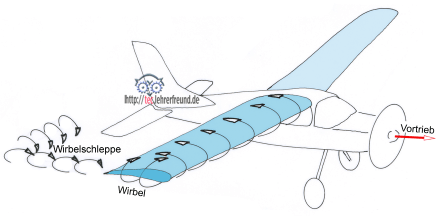 In der Luft entstehen am fliegenden Flugzeug so genannte Randwirbel. Sie entstehen, weil der niedrige Druck an der Flügeloberseite und der höhere Druck an der Flügelunterseite sich zum Rand hin ausgleichen. Auf der Oberseite der Tragfläche strömt die Luft zum Flugzeugrumpf hin und auf der Unterseite zu den Flügelspitzen hin. Diese Querströmungen auf beiden Seiten der Tragfläche bewirken, dass an der Flügel-Hinterkante Wirbel entstehen, die insgesamt eine Wirbelschleppe bilden, mit der Folge eines Auftriebsverlusts. Die an den äußeren Flügelenden entstehenden Wirbel sind für den so genannten induzierten Widerstand verantwortlich.