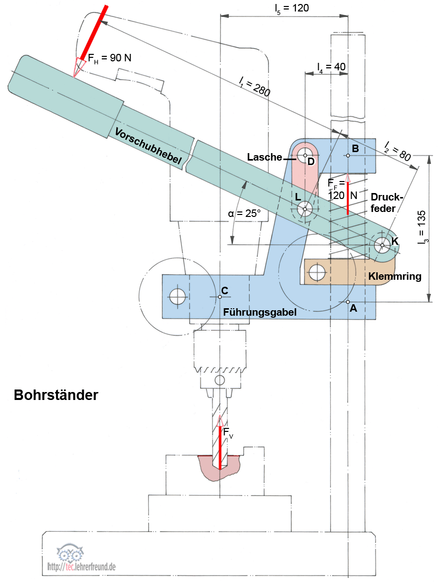 Am Werkzeug, hier dem Bohrer, entsteht beim Bohren die senkrechte Vorschubkraft FV; sie kann auf ihrer Wirklinie in den Punkt C verschoben werden und wirkt damit an der Führungsgabel.