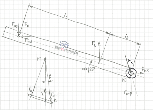 Kleine Skizze: Über die Richtung von FK können wir uns Klarheit verschaffen, wenn wir den Regeln zum 3-Kräftesystem folgen: Bringen wir die Kräfte FH und FL, deren Wirklinien ja bekannt sind, zum Schnitt in P1, dann muss auch die Lagerkraft FK durch den Punkt P1 gehen (Erläuterungen dazu im Beitrag »Kräfte: Unbekannte Kräfte zeichnerisch ermitteln (1)«).