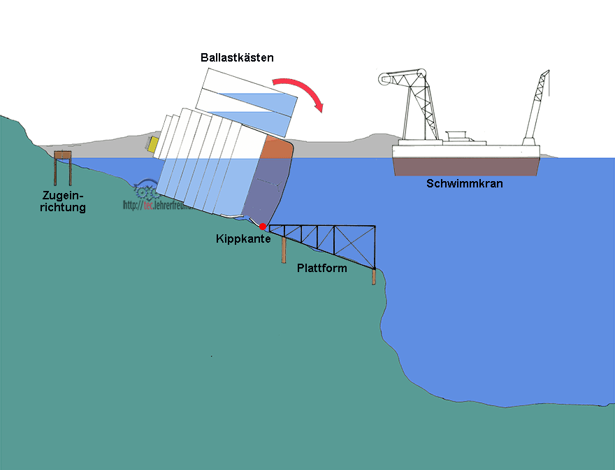 Bild 5 unten: Mithilfe eines Schwimmkrans und anderer Hilfseinrichtungen wird das Wrack in die senkrechte Lage gezogen. Dabei erzeugen riesige, Wasser gefüllte Stahlkästen nach rechts drehende Momente. Sie helfen, das Schiff aufzurichten. Später werden sie als Schwimmhilfen dienen.