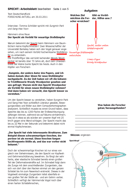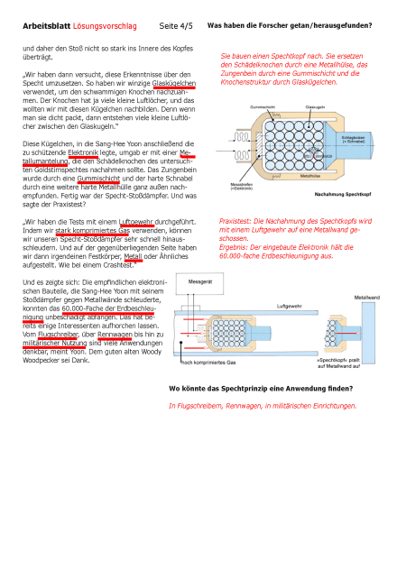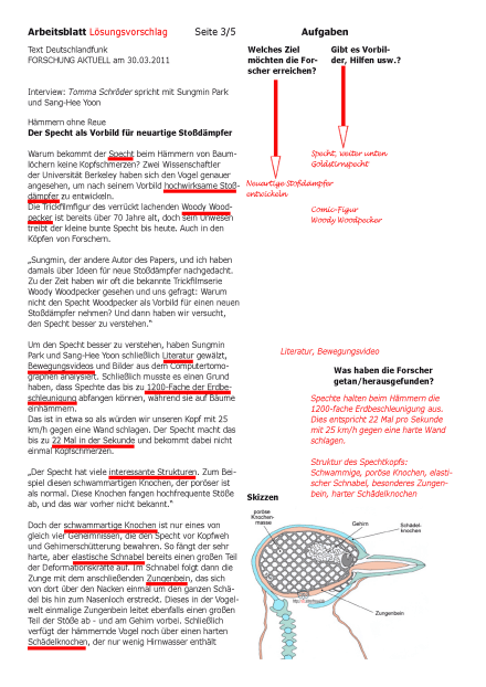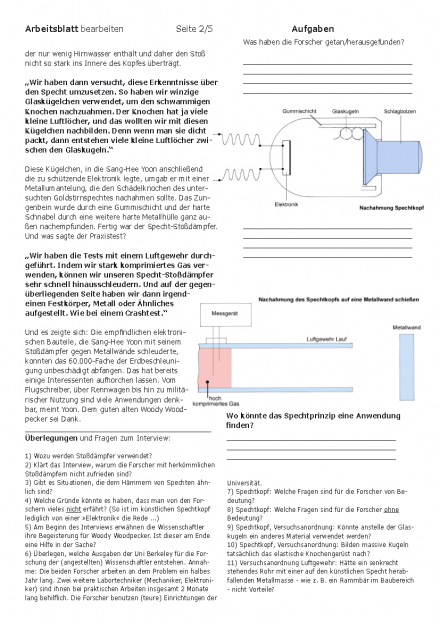 Ist es sinnvoll, auf der Basis unvollständiger Informationen das Gesamtbild eines Naturphänomens zu entwickeln? Hier geht es um die Frage, was der Kopf eines hämmernden Spechts mit der Entwicklung neuartiger Stoßdämpfer zu tun hat. Nach der Analyse eines Interviews mit den Specht-Forschern - Das Geheimnis des Spechts (1) - machen wir hier Vorschläge für Arbeitsblätter.