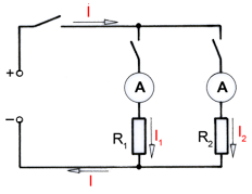 - Die Teilströme I1 und I2 addieren sich zum Gesamtstrom I = I1 + I2