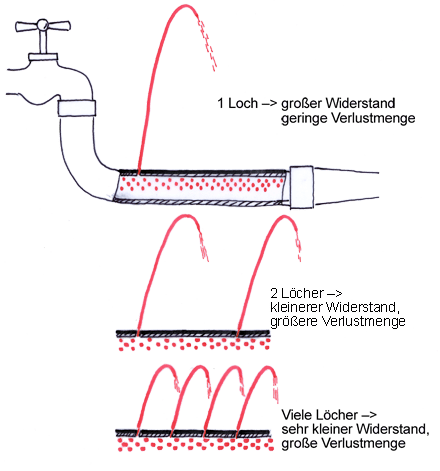Schlauchversuch: Je mehr loecher im Schlauch (=Widerstaende), desto geringer der Widerstand