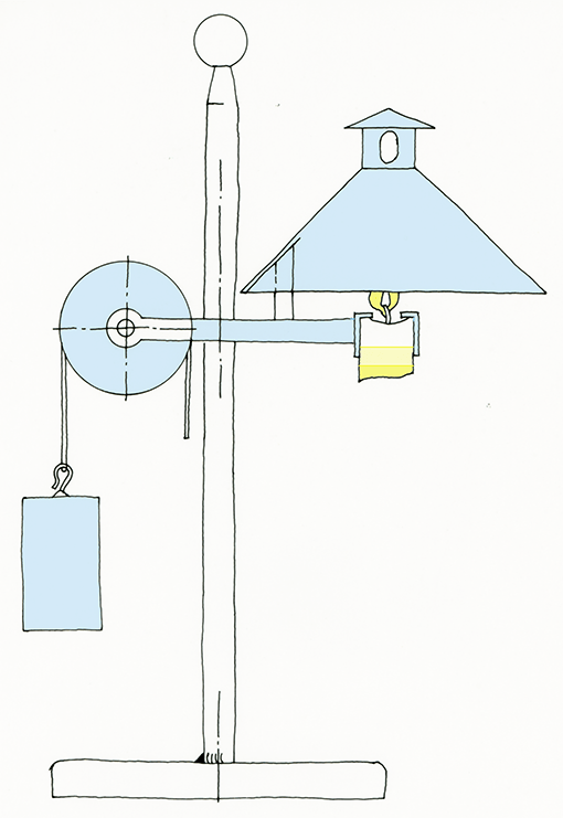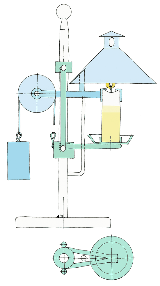 Aufgabe: Wir wollen es dem Leser nicht zu einfach machen und fragen ihn: Wie funktioniert diese Kerzenlampe? Wir bieten eine Hilfe an (Bild): Mit dem auf dem Tisch stehenden Ständer ist der Lampenschirm und die Rolle mit Kordel und Gewicht fest verbunden.