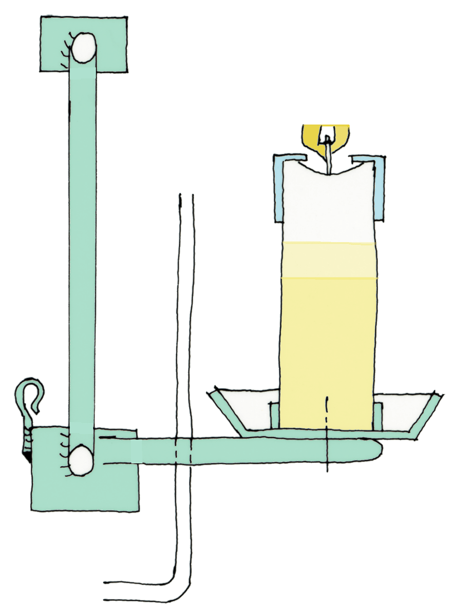 Über die Rolle zieht das feste System (blau gezeichnet) das untere bewegliche System (grün gezeichnet), den Schlitten, mit der Kerze nach oben. Wie schnell dieser Schlitten nach oben wandert, hängt von der Abbrenngeschwindigkeit der Kerzenmasse und der im oberen Deckel entstehenden Temperatur ab. Dort wird das Wachs weich und wird von der über das Seil eingeleiteten Druckkraft zusammengestaucht. Der Stauchvorgang gibt die sehr kleine Verschiebebewegung der Kerze vor.