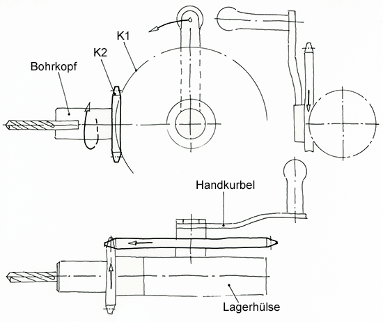 K1 dreht sich auf der feststehenden Lagerhülse. Die gewählte Anordnung führt für K2 zu einem Rechtslauf, der auf den Bohrkopf übertragen wird. Wenn das K2 z. B. halb so groß ist wie K1, entsteht eine Übersetzung 1 : 2 ins Schnelle.