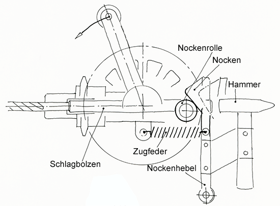 Mittig durch die Lagerhülse und das K2 wird ein massiver Schlagbolzen geführt. Auf K1 sitzt eine Rolle, die bei jeder Umdrehung auf den Nocken aufläuft. Dieser drückt dabei den Nockenhebel nach rechts und spannt die Zugfeder. Wenn die Rolle den Nockenkamm passiert hat, zieht die Zugfeder den Nockenhebel abrupt zurück. Dieser schwenkt den an ihm befestigten Hammer nach links, der auf den Schlagbolzen schlägt. Der Schlag wirkt sich direkt auf den Dübelbohrer aus.