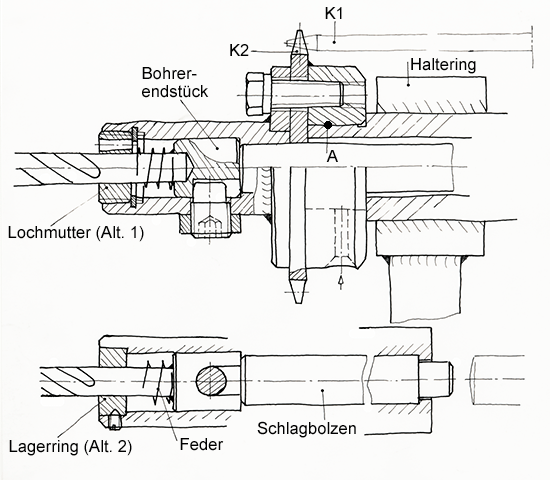 K2 dreht sich auf dem Hals A der Lagerhülse. Der Bohrkopf ist mit K2 fest verbunden und dreht mit K2. Ein Gewindestift greift in die Nute des angeschweißten Bohrerendstücks ein und nimmt dieses zusammen mit dem Dübelbohrer mit. Der vom Schlagbolzen herkommende Hammerschlag überträgt sich auf den Dübelbohrer. Nach dem Schlag drückt die Feder den Bohrer wieder an die rechte Anschlagfläche zurück.