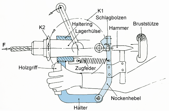 Antrieb und Schlagmechanik werden in eine gemeinsame Halterung eingebettet (blau angelegt). Von einem die Lagerhülse umfassenden Haltering ausgehend nimmt der Halter den schwenkbaren Nockenhebel auf. Der der Bohrkraft entgegen wirkende Widerstand F benötigt eine Gegenkraft, die – weil keine Hand mehr frei ist – von der Bruststütze aufgebracht wird.