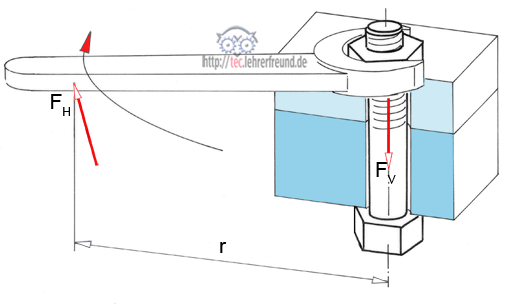 Eine Schraube M12 ist anzuziehen. Der Wirkungsgrad µ wird mit 0,6 angegeben. Der Schraubenschlüssel hat eine Länge r = 200 mm; er wird  mit einer Handkraft FH = 70 N gedreht. Welche Vorspannkraft FV entsteht beim Anziehen der Schraube?