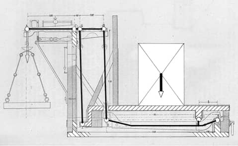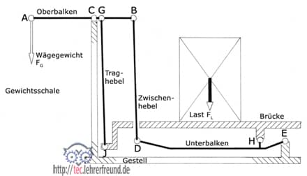 Eine Dezimalwaage muss so gebaut sein, dass bei Wiegebewegungen die Brücke ihre horizontale Position beibehält. Ganz präzise ist dies mit dem Gelenkparallelogramm möglich.