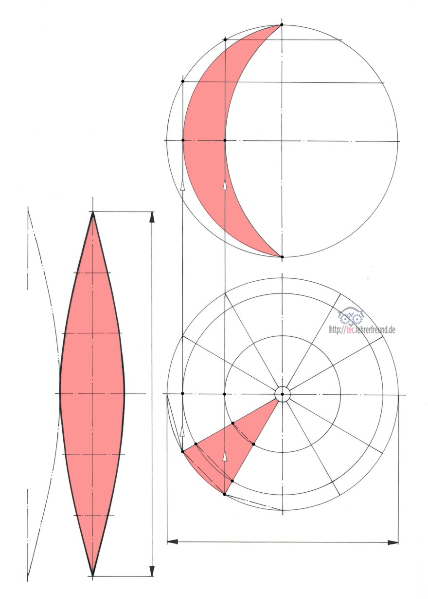 Draufsicht: Sie ist gleichmäßig geteilt, hier zwölf Mal, mit Nummerierung am Außenkreis von 0 bis 12. Von den Punkten 0 und 1 fällt man Lote auf die Mittellinie 2 – 8 und zieht diese durch in die Vorderansicht. In der Draufsicht ergeben die Lote die Schnittpunkte S0 und S1, ebenso in der VA.