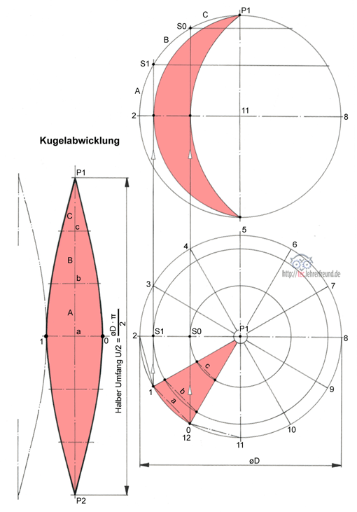 Anmerkung: Werden die Einzelabwicklungen zu einer Kugel zusammengebogen, dann wäre eine saubere Kugelform, auch in Umfangsrichtung, kaum ohne Gewaltanwendung denkbar. Wir werden also nur eine angenäherte Kugel erhalten mit in Umfangsrichtung zwölf ebenen Einzelsegmenten. Solche kann man zum Beispiel bei vielen Zwiebeltürmen beobachten.