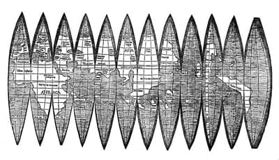 Wie Waldseemüller auf die flachspitzige Form kam, wissen wir nicht; vielleicht hat er sie von einer geschälten Orange abgespickt. Ganz sicher hat er immer wieder Versuche mit Kugeloberflächen angestellt und erkannte als geschulter Geometer sehr schnell, dass die abgewickelte Form so aussehen musste.