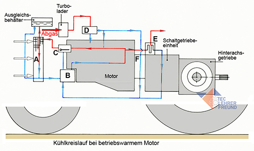 Die Komponenten des Kühlkreislaufs sind teilweise im Motorblock eingebaut und mit Schlauchleitungen miteinander verbunden. In diesem geschlossenen System zirkuliert das von einer mechanischen oder elektrischen Pumpe angetriebene Kühlmittel.